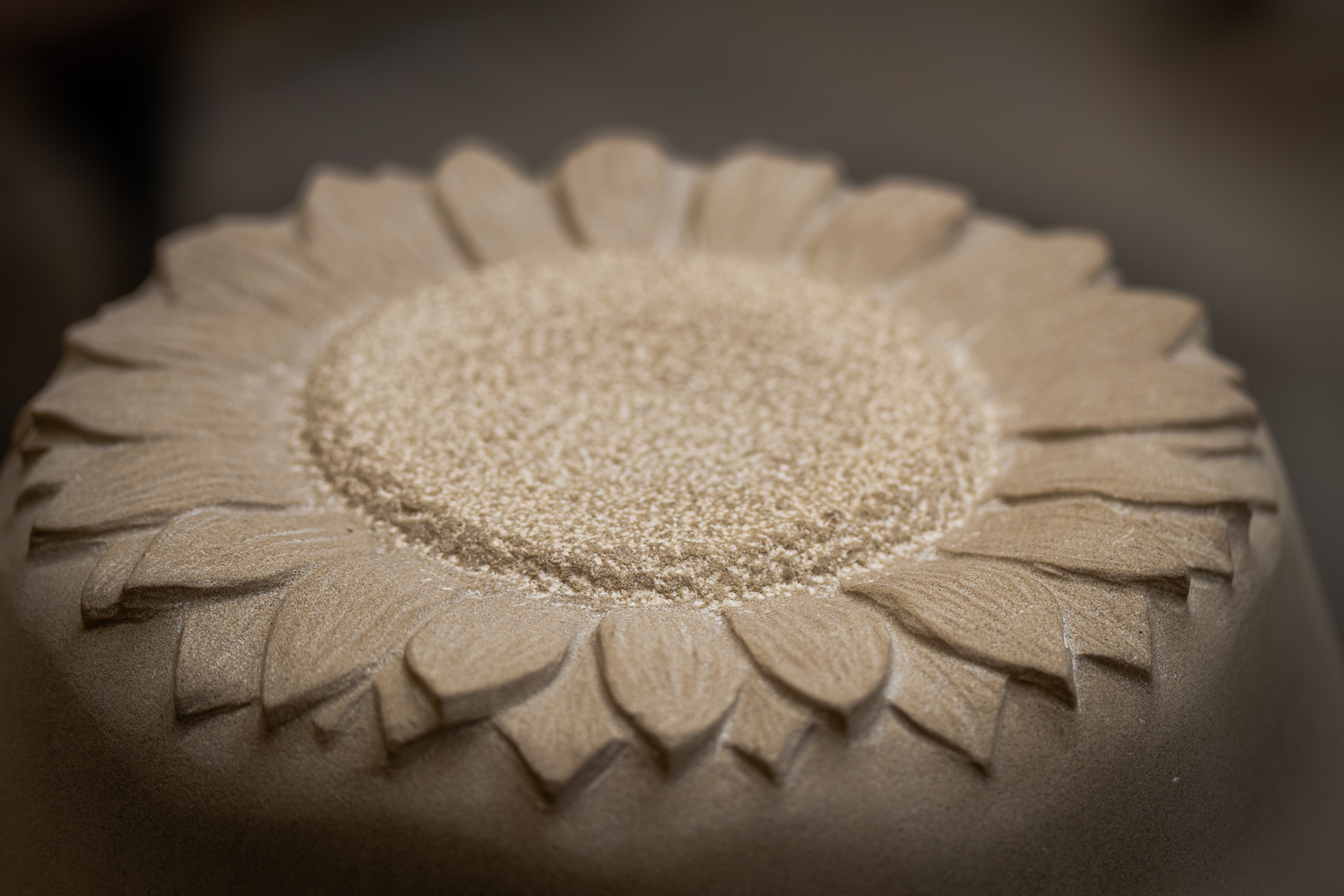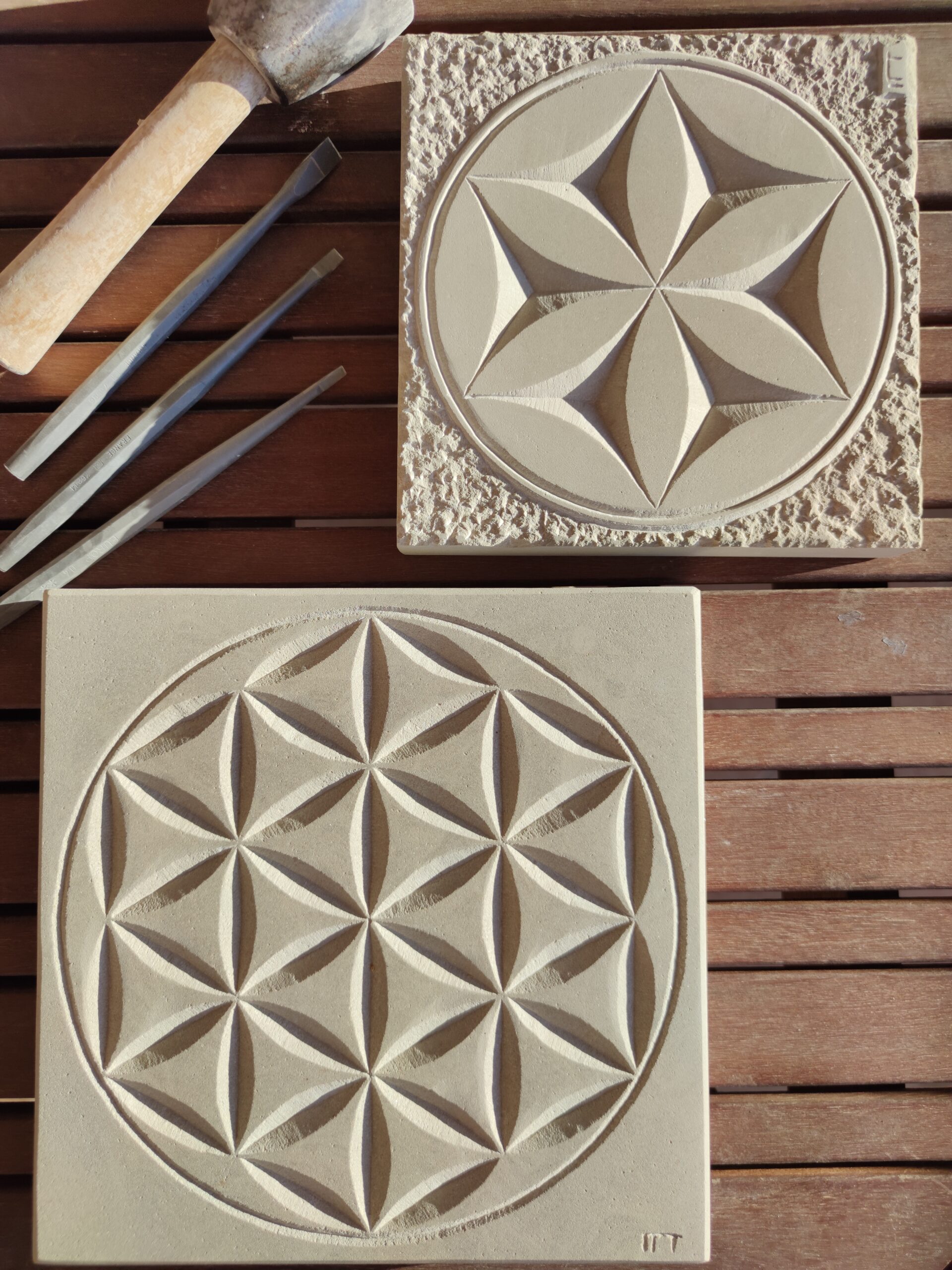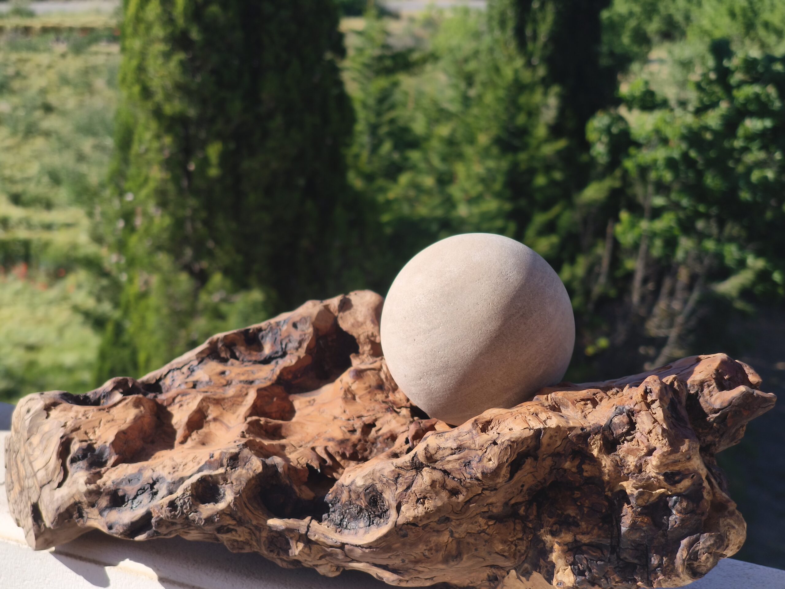 Escultura de pedra natural Abraçada Talaia (Granadella 2023) Geometria sagrada Aferrament GrMans Esfera Homenatge als artistes de el Soleràs (2025) Kintsugi Gat pont